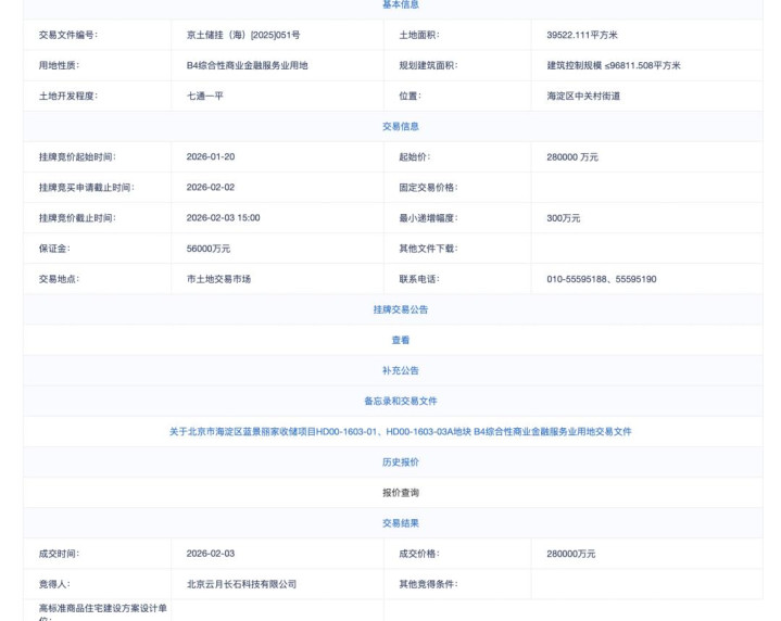 2月3日,从北京市规划和自然资源委员会官网获悉,字节跳动全资子公司——北京云月长石科技有限公司,以28亿元底价竞得海淀区两宗商业地块,此次交易也是北京2026年首场土拍的重要组成部分。