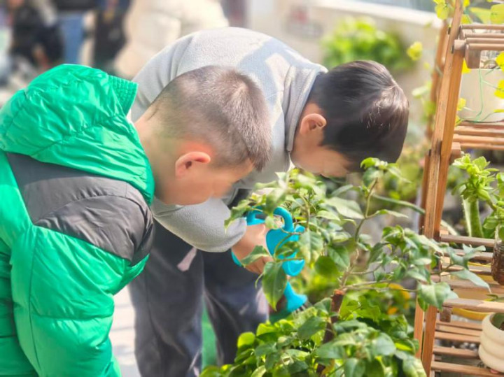 特需幼儿当值日生给植物浇水。