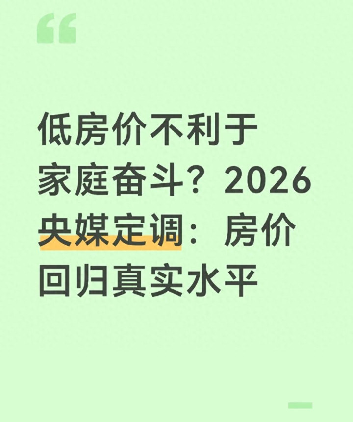 最近“低房价不利于家庭奋斗”的话题吵得火热,有人说“房价太低没奔头,年轻人不想加班奋斗”,也有人反驳“房价高才压得人喘不过气,哪有心思奋斗”。刚好2026年开年央媒连续发声,明确“让房价回归真实水平”,不是让房价暴跌也不是重启暴涨,而是让房价和人口、产业、收入匹配,既不让刚需望而却步,也不让辛苦奋斗的家庭资产缩水。