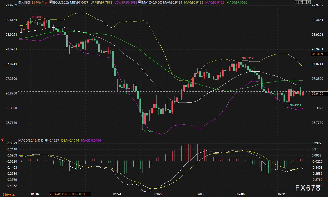 美元指数的240分钟走势显示,市场在1月27日触及95.5625的阶段低点后,虽经历一轮反弹至98.03一线,但2月上旬再度回落至96.90附近,呈现“反弹高度递减、承压特征延续”的运行特征。当前报价96.9129与短期均线完全重合,但显著低于MA50均线97.3026,空头排列格局未发生实质性扭转。布林带指标同样呈现价格位于中轨下方、通道收窄的状态,波动率从1月下旬的高位明显回落。值得注意的是,美元指数MACD已于负值区间形成金叉,DIFF线位于DEA线上方,与美债收益率MACD的底背离信号形成一定反差。这一技术分化反映出:美元资产的定价逻辑中,汇率端已计入部分宽松预期,但债市仍在等待更明确的政策信号加以确认。从关联性角度观察,1月中旬至下旬美元指数与美债收益率同步回落,显示避险情绪升温阶段美元并未有效发挥避险功能;而2月以来美元指数反弹乏力、美债收益率低位运行,两者呈现低位共振特征。知名机构观点认为,市场对美联储货币政策转向的预期正在重新定价,这一宏观逻辑对美元构成压制,同时也限制美债收益率的上行修复空间。
