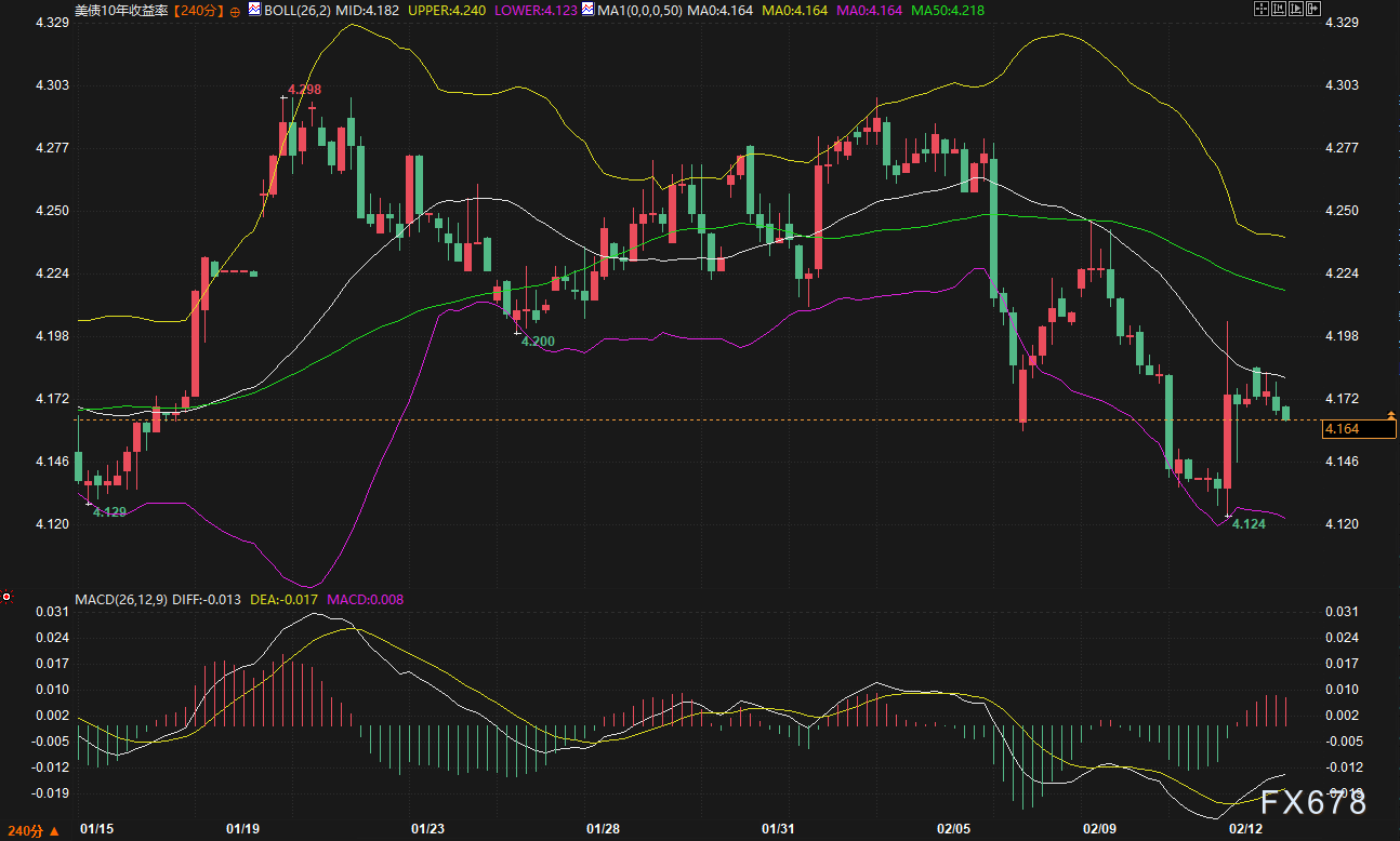 从240分钟K线结构观察,10年期美债收益率自1月20日触及4.298%的阶段高点后,呈现“双顶—回落—低位盘整”的运行路径。2月10日下探4.124%后小幅反弹,当前价格位于4.164%,与短期、中期均线高度粘合。这一技术特征通常意味着市场短期成本趋于一致,多空力量暂时进入弱平衡状态。