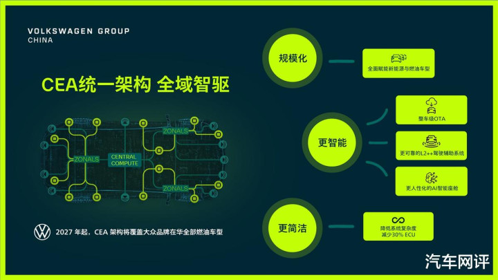 而ID. AURA之所以能实现快速量产,核心就在于一汽-大众全新打造的CMP紧凑型纯电平台与CEA电子电气架构这一技术组合。CMP平台由中国团队主导研发,针对中国用户的空间、能耗、成本需求量身打造,可灵活适配不同电池包与电驱系统,从根源上优化产品竞争力;CEA架构采用区域控制与准中央计算模式,控制单元数量减少30%,算力提升至500TOPS,支持整车全生命周期OTA升级,让智能驾驶、座舱交互的迭代速度匹配中国市场节奏。