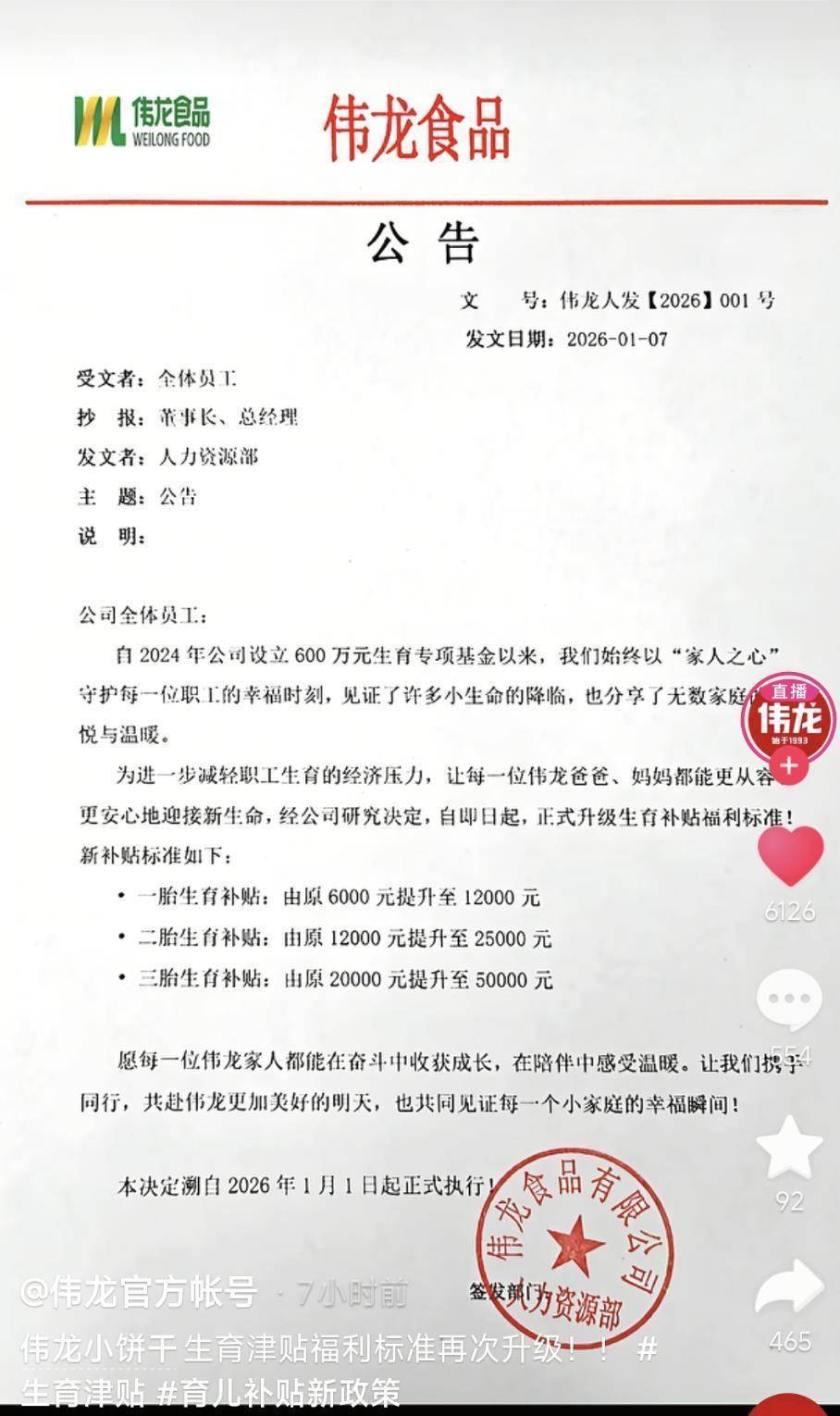 “1月1日起,生育补贴福利标准升级!其中,三胎生育补贴由原来的2万元提升至5万元。”1月14日,以生产小饼干闻名的山东伟龙食品有限公司在社交平台发布这样一则公告,引来网友羡慕。